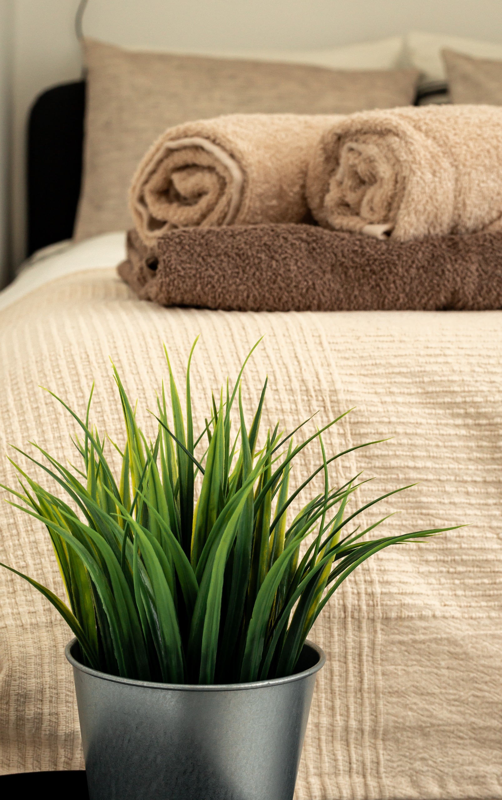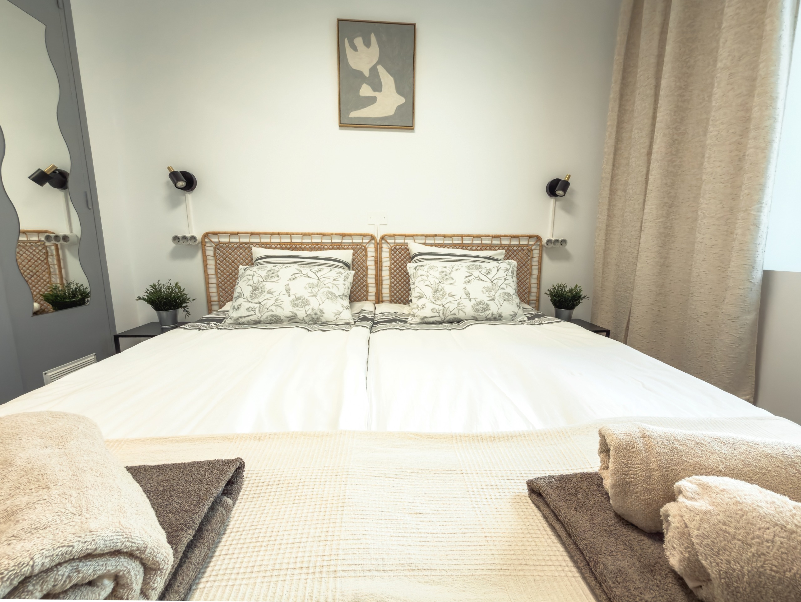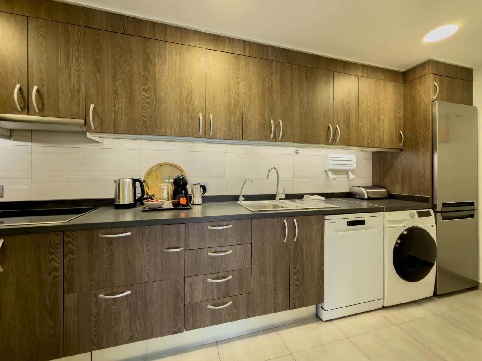 The apartment is located on a small side street, just a few minutes’ walk from restaurants, shops, and a 10-minute walk from the golden sand beach. The gated complex offers complete comfort and tranquility with a cozy garden, pool, and its own private parking.